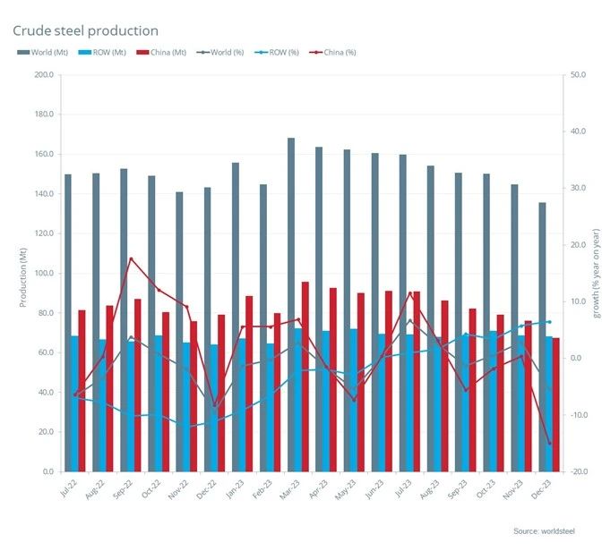 2023年12月全球71個納入世界鋼鐵協(xié)會統(tǒng)計國家的粗鋼產(chǎn)量為1.357億噸,同比下降5.3%。