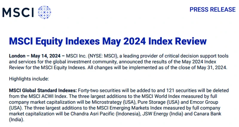 公告顯示,MSCI全球標準指數新增42只個股,剔除121只個股,本次全球指數中市值最大的新納入個股包括Microstrategy(美股)、Pure Storage(美股)以及Emcor Group(美股)。其中,軟件服務公司Microstrategy(微策略)為比特幣持倉大戶。MSCI新興市場指數新增成分股中全市值前三大的股票為Chandra Asri Pacific(印度尼西亞), JSW Energy(印度)以及Canara Bank(印度)。