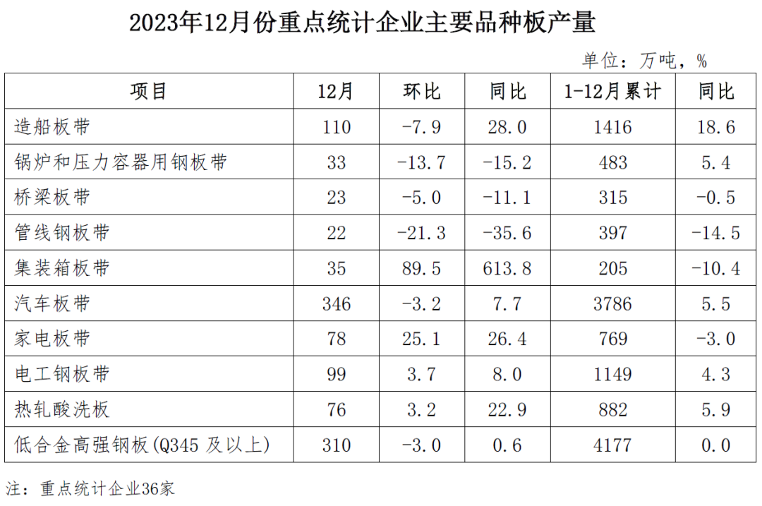 2023年12月,重點統計企業主要品種板中,造船板、集裝箱板和家電板產量同比增幅較大,鍋爐容器板、橋梁板和管線鋼板產量同比降幅較大。