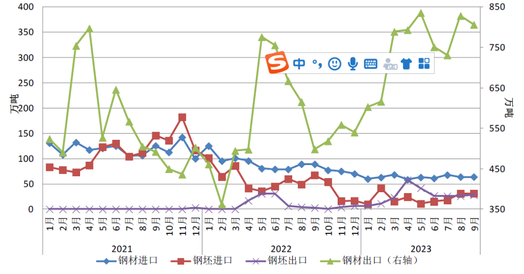 前三季度,國內(nèi)鋼鐵供應(yīng)強(qiáng)于需求,鋼產(chǎn)量同比增長1.7%,建筑業(yè)用鋼需求收縮,粗綱表觀消費(fèi)量同比下降1.5%,出口增長一定程度上緩解國內(nèi)供需矛盾。近期全球地緣政治沖突升級,或增加全球經(jīng)濟(jì)發(fā)展不確定性,并對全球產(chǎn)業(yè)鏈供應(yīng)鏈體系產(chǎn)生負(fù)面沖擊效應(yīng)。短期來看,國內(nèi)外鋼鐵需求一般,海內(nèi)外價差繼續(xù)收窄,企業(yè)出口接單量下滑,預(yù)計鋼材出口量將繼續(xù)回落,進(jìn)口延續(xù)低位運(yùn)行。