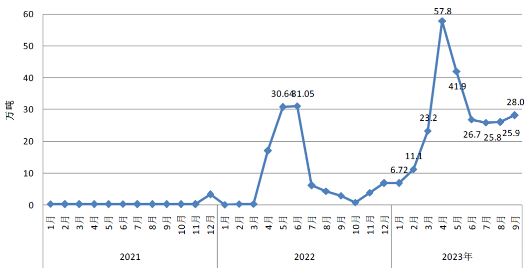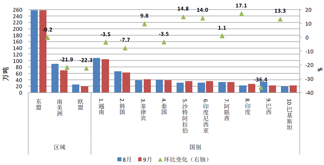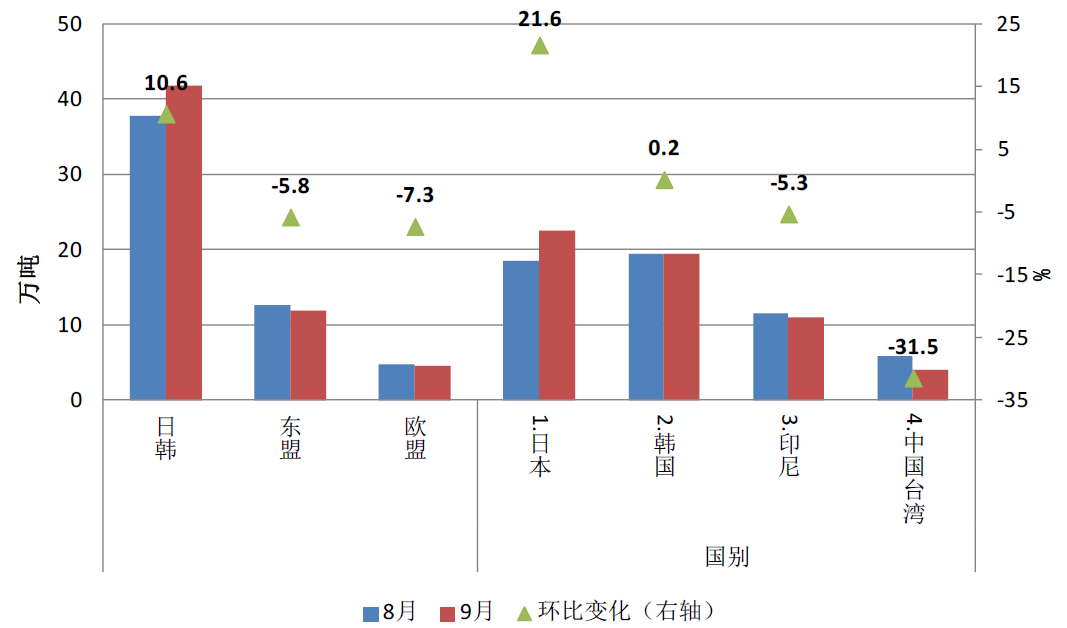 9月,我國自日本、韓國合計進(jìn)口41.9萬噸,環(huán)比增長10.6%,占進(jìn)口總量65.4%;其中自日本進(jìn)口22.4萬噸,環(huán)比增長21.6%。自東盟進(jìn)口11.8萬噸,環(huán)比減少5.8%,其中印尼進(jìn)口量環(huán)比減少5.3%至10.9萬噸。
