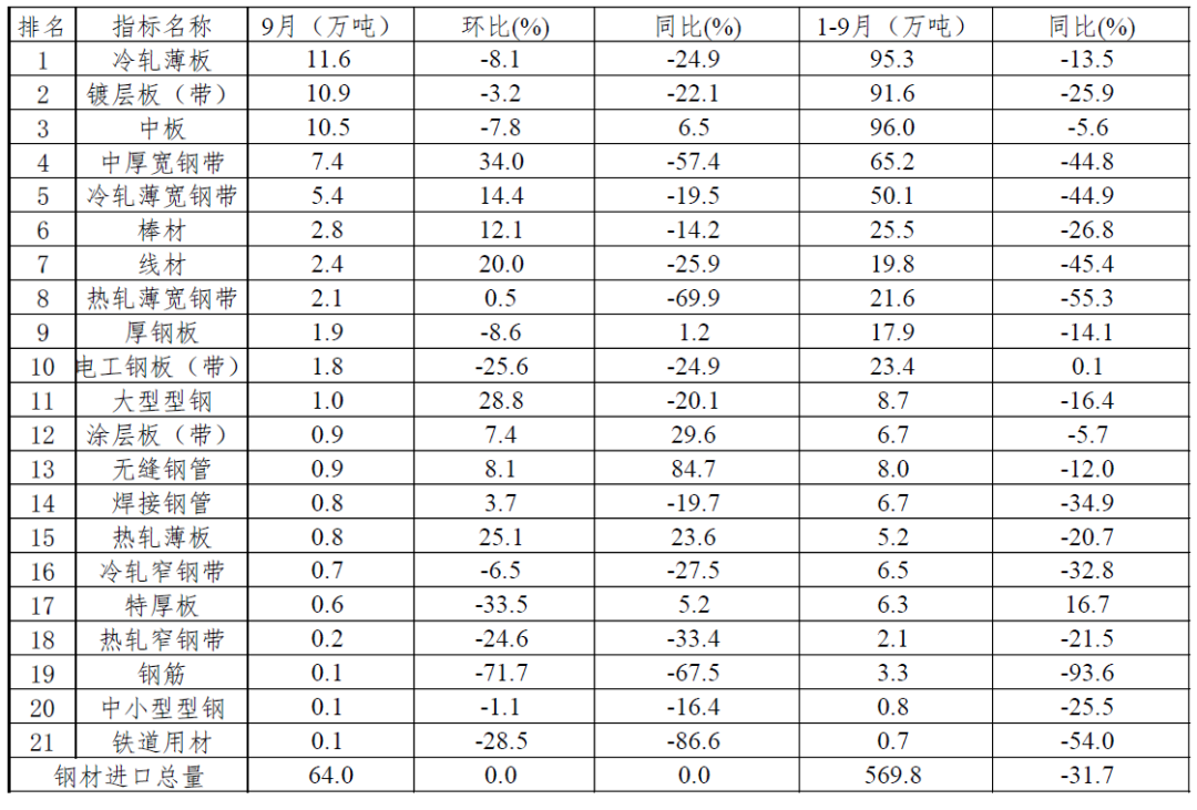 表5 2023年9月主要初級鋼鐵產(chǎn)品進(jìn)口情況