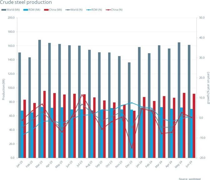 2024年6月全球71個納入世界鋼鐵協會統計國家的粗鋼產量為1.614億噸,同比提高0.5%。
