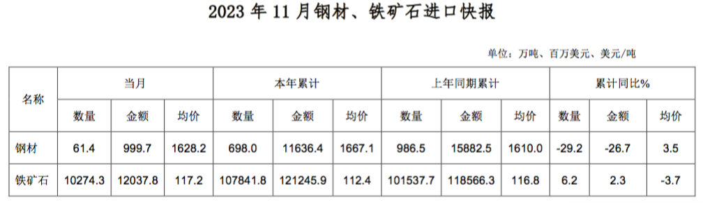 根據(jù)海關(guān)統(tǒng)計快訊數(shù)據(jù),2023年11月,我國進(jìn)口鋼材61.4萬噸,環(huán)比減少5.4萬噸,降幅8.1%;均價1628.2美元/噸,環(huán)比上漲111.1美元/噸,漲幅7.3%。1-11月累計進(jìn)口鋼材698.0萬噸,同比減少288.5萬噸,降幅29.3%。