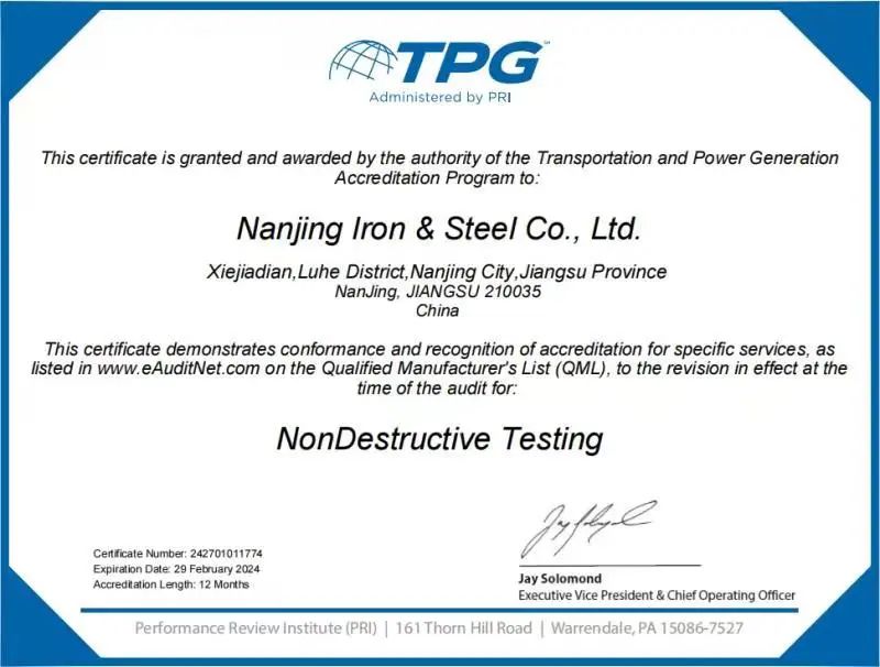 1月26日,南鋼獲得美國PRI頒發的TPG特殊過程(無損檢測)認證證書,標志著南鋼已進入PRI官方供應鏈采購名錄,南鋼產品進入交通運輸和能源行業的高端市場取得了官方通行證。